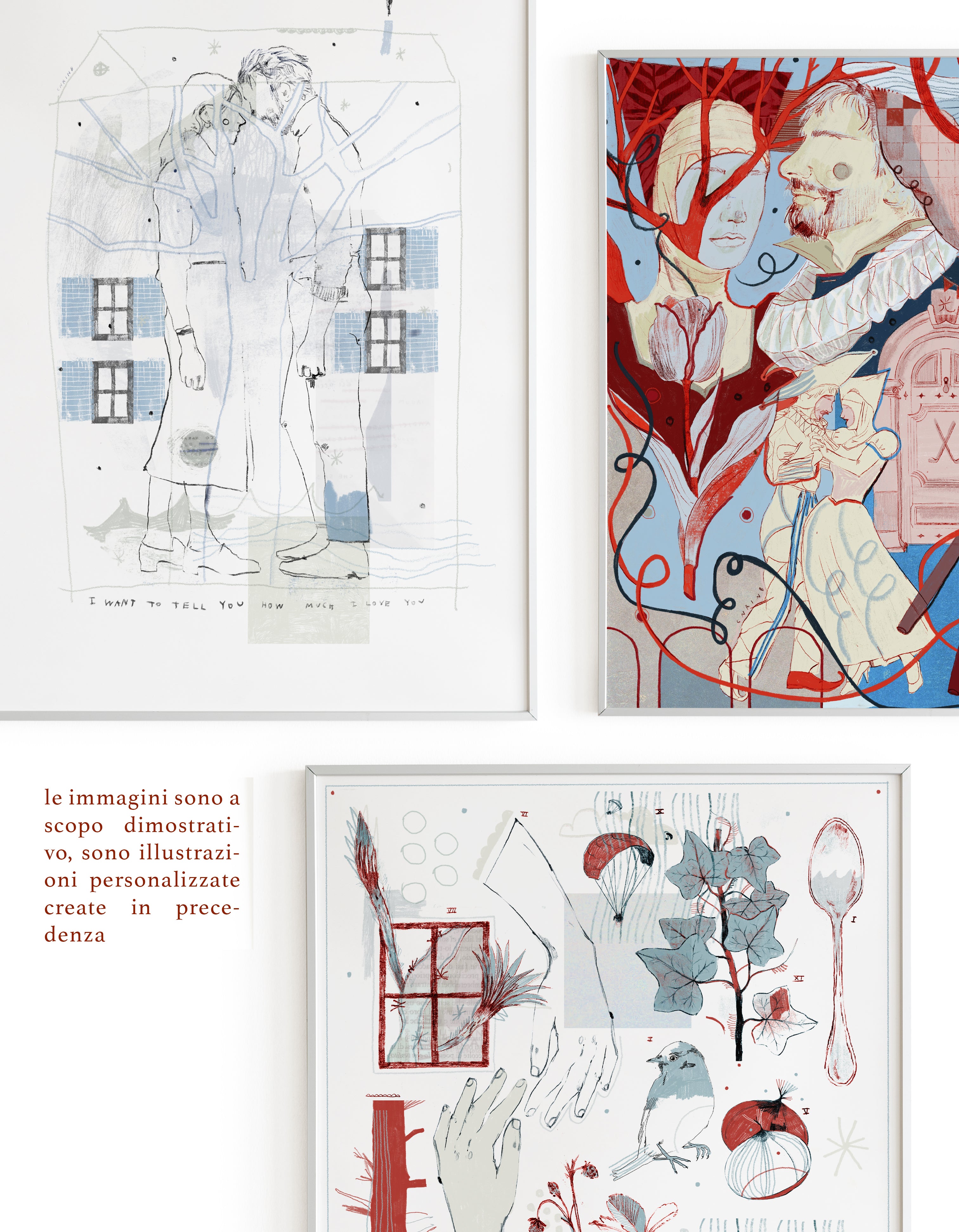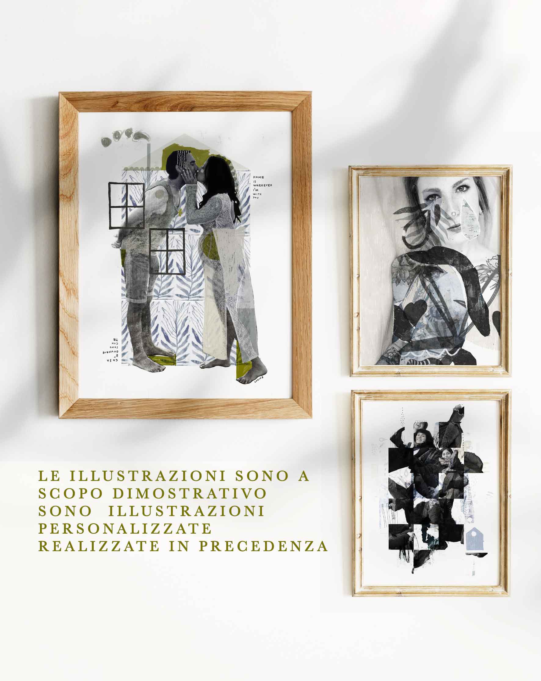 Ideali come dono speciale o per celebrare momenti importanti, queste illustrazioni portano su carta tutto ciò che desideri, con tratti e colori studiati per riflettere ogni dettaglio emotivo. Ogni tavola diventa così un’opera personale e sartoriale, senza rinunciare al profumo della carta, texture e sovrapposizioni di collage, inchiostri, acrilici e tanto altro.