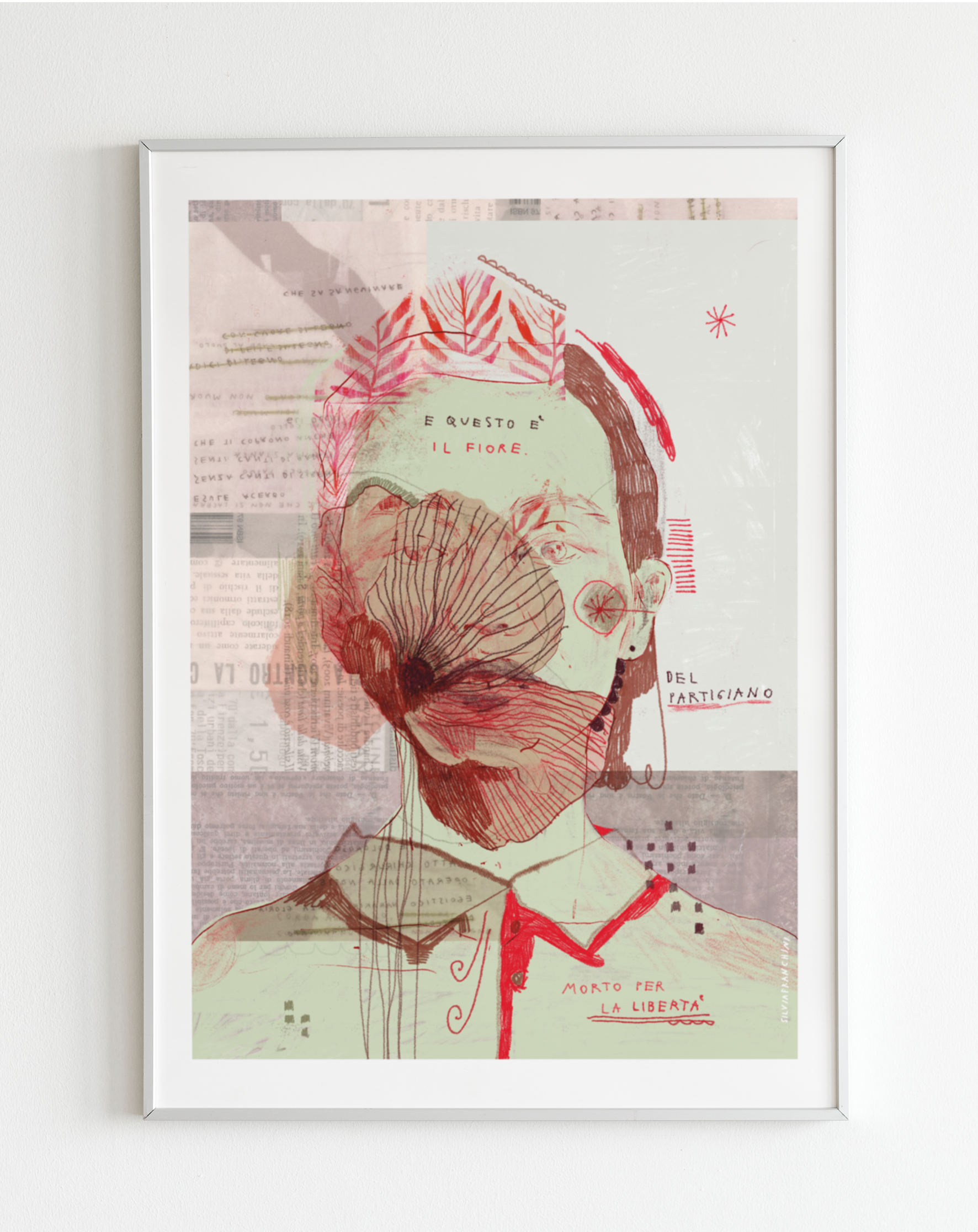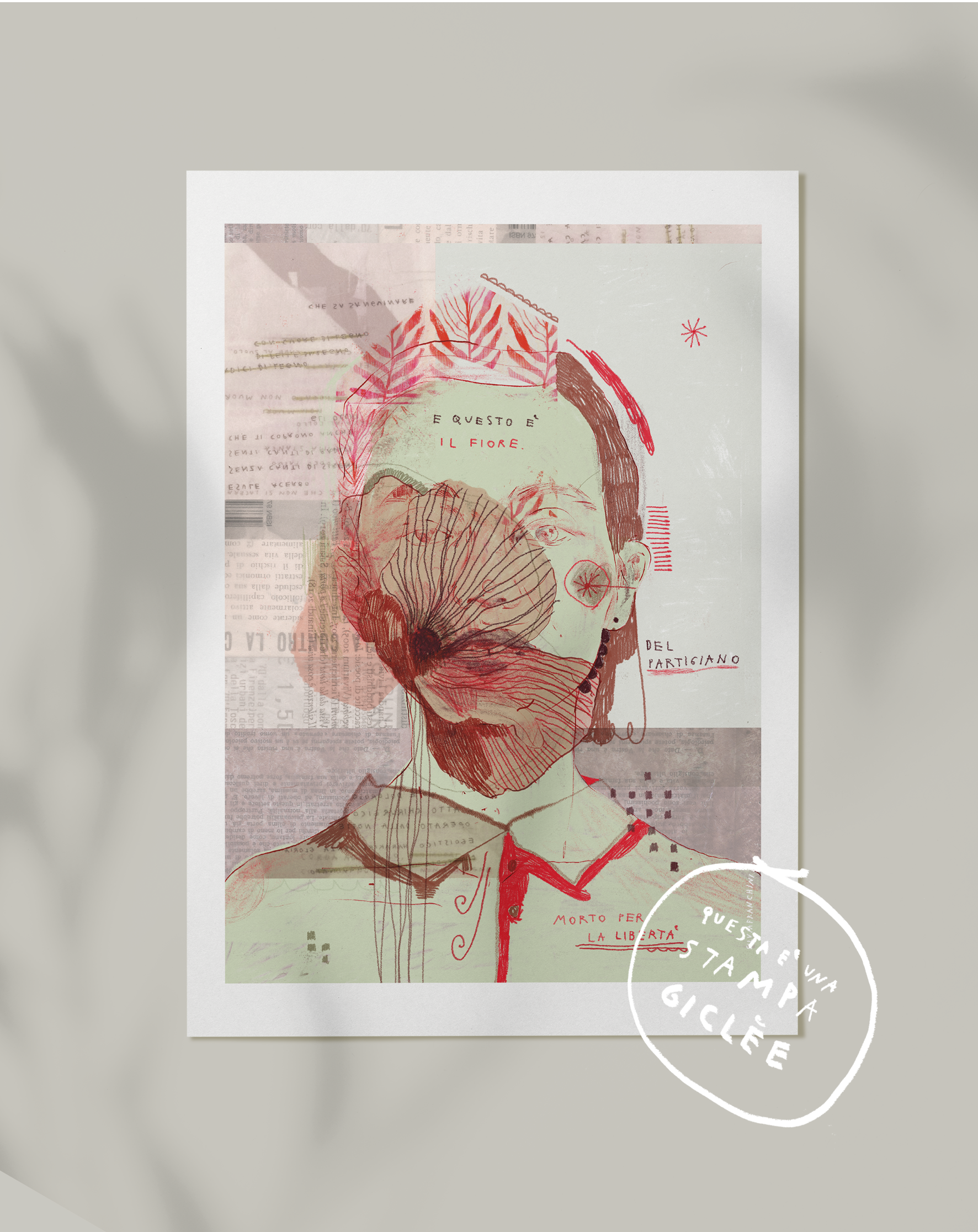 ho cercato di trasmettere un’atmosfera di resistenza delicata, quasi poetica. Che preserva un eco di violenza, ma si rivolge soprattutto ad un’idea sottile e costante di rivoluzione. Da qui le parole inserite: “e questo è il fiore del partigiano morto per la libertà". Come a sottintendere che ogni volto, ogni gesto, mantenga immemore il sacrificio di una società che resiste, così come resistono i valori e la memoria collettiva di chi lotta.