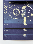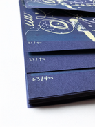 Stampata in edizione limitata da Malleus a Tortona, la serigrafia misura 35x50 cm ed è stata impressa a tre colori su pregiata carta da stampa blu, con l’inserimento di un blu metallico sfumato.